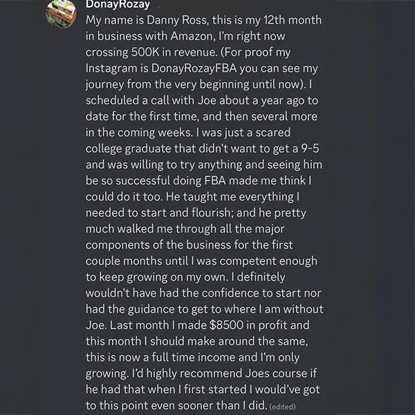 "Joe showed me the best strategies and tools to be a successful FBA seller"